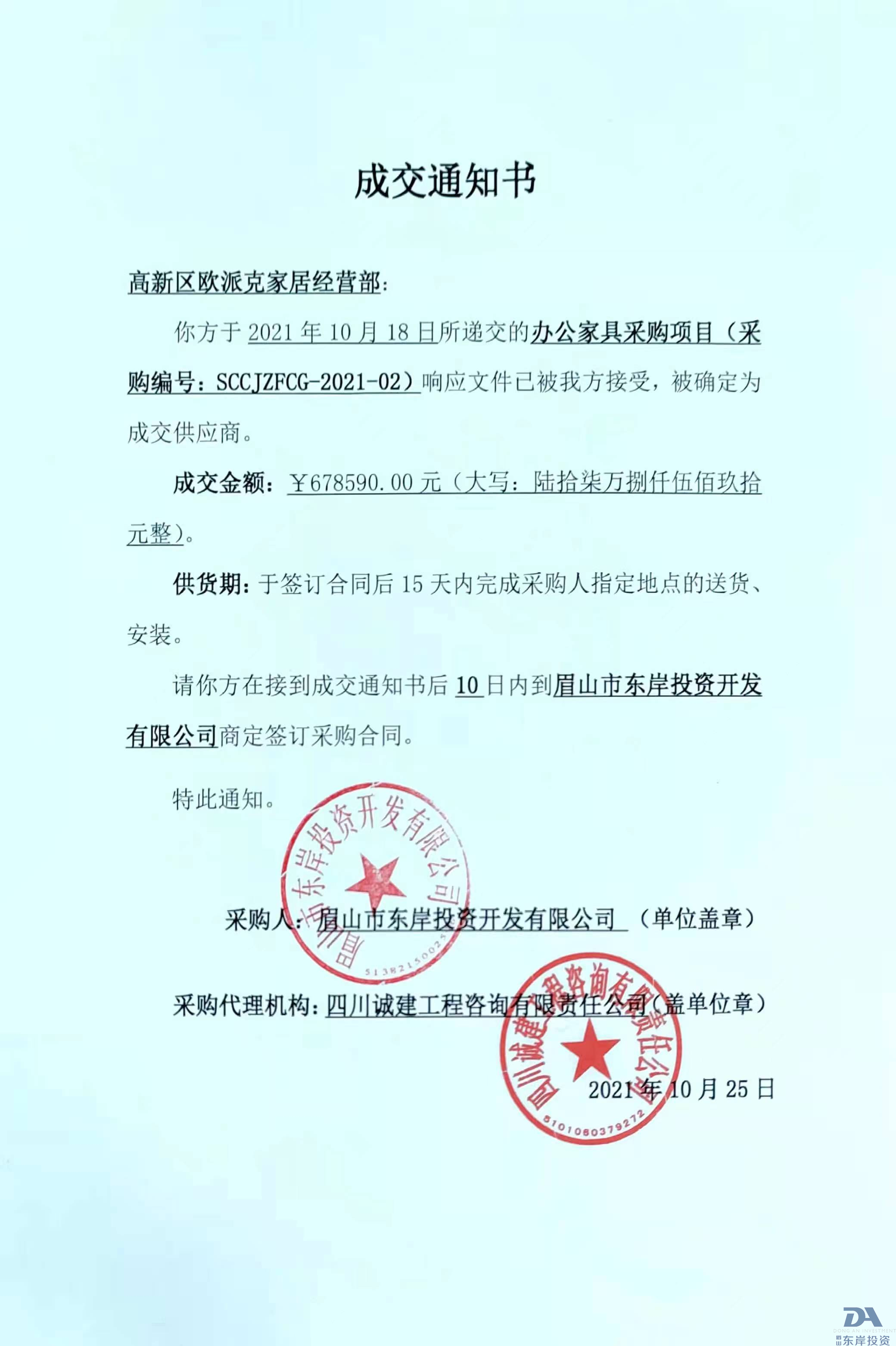 眉山市東岸投資開發(fā)有限公司辦公家具采購項目結(jié)果公示